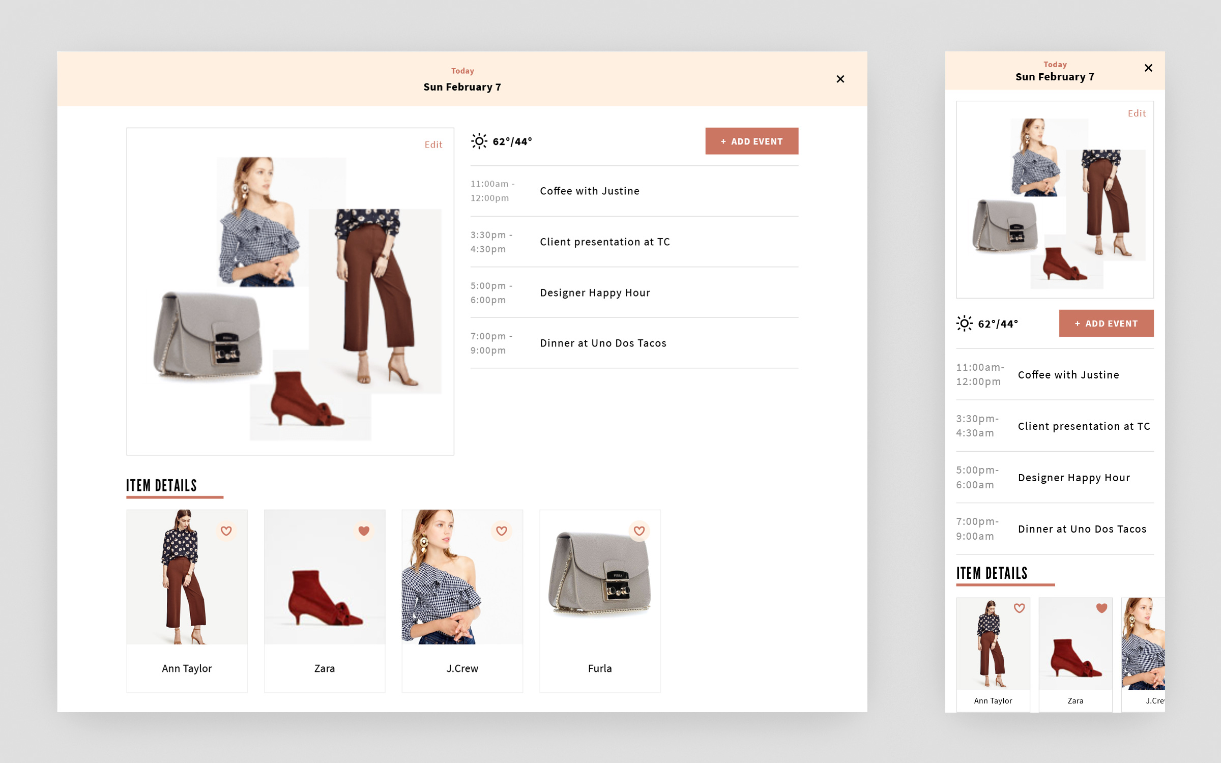 これらを「My Wardrobe」「My Looks」「Inspiration」という3つの項目に分け、My WardrobeとWishlistなどの関連した情報はタブでまとめました。ユーザーはこれら3つの項目の中からアイテムを選び、カレンダーに登録することができます。
